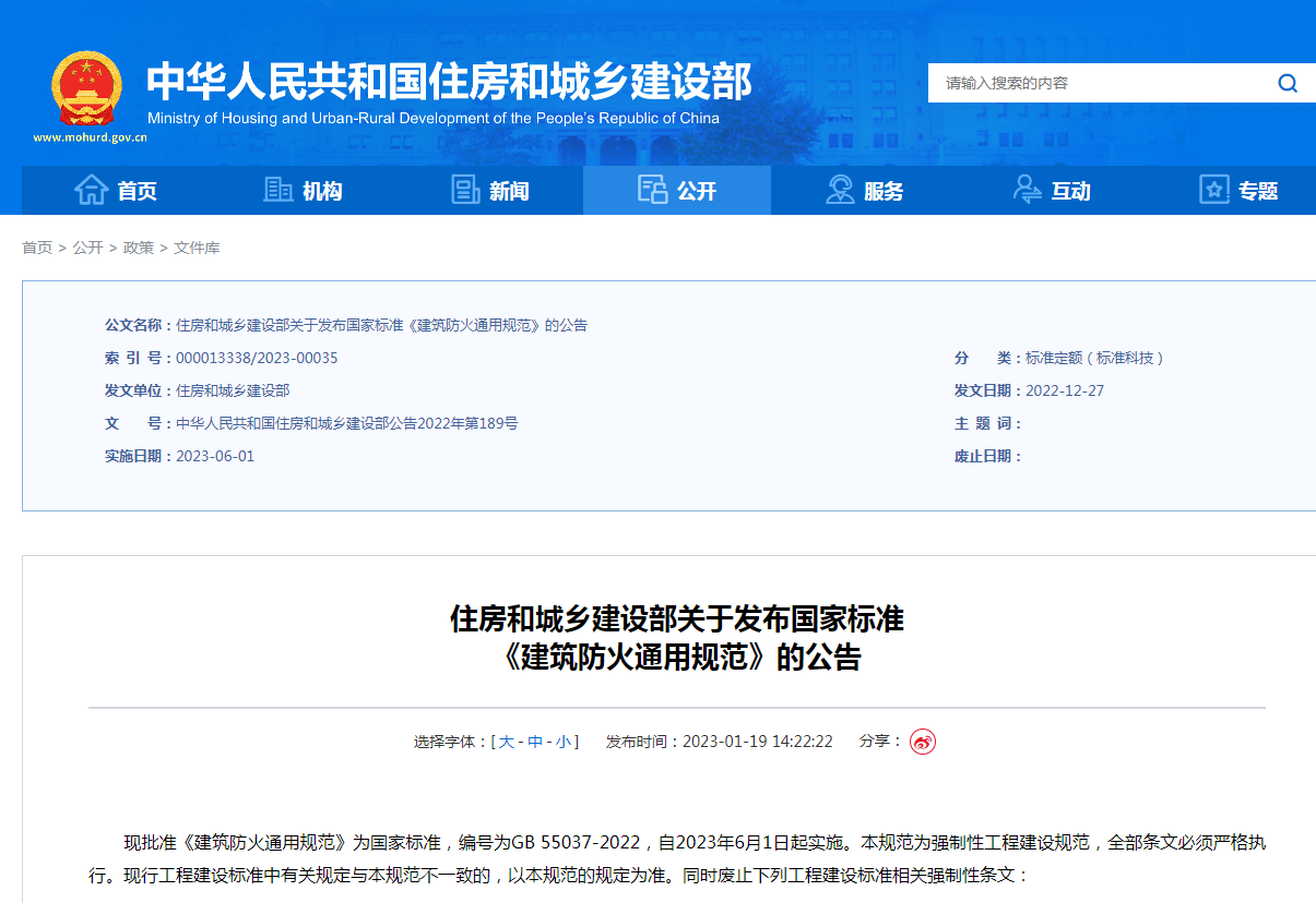 現(xiàn)批準(zhǔn)《建筑防火通用規(guī)范》為國家標(biāo)準(zhǔn),編號為GB 55037-2022,自2023年6月1日起實施。本規(guī)范為強制性工程建設(shè)規(guī)范,全部條文必須嚴(yán)格執(zhí)行?,F(xiàn)行工程建設(shè)標(biāo)準(zhǔn)中有關(guān)規(guī)定與本規(guī)范不一致的,以本規(guī)范的規(guī)定為準(zhǔn)。同時廢止下列工程建設(shè)標(biāo)準(zhǔn)相關(guān)強制性條文: