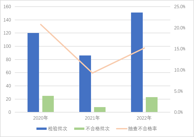 (五)危險(xiǎn)化學(xué)品包裝物不合格率為15.2%。本次抽查18個(gè)省(區(qū)、市)151家企業(yè)生產(chǎn)的151批次產(chǎn)品,發(fā)現(xiàn)23批次產(chǎn)品不合格,抽查不合格率為15.2%,較上次抽查上升5.9個(gè)百分點(diǎn)。該產(chǎn)品近3年抽查不合格率分別為20.8%、9.3%、15.2%。