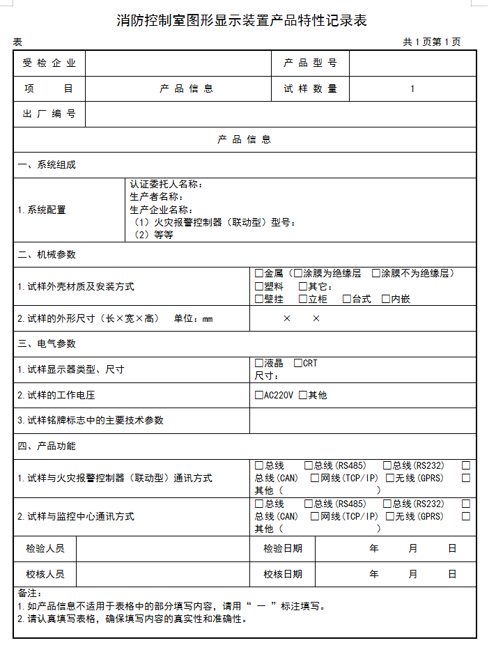 消防控制室圖形顯示裝置產(chǎn)品特性記錄表